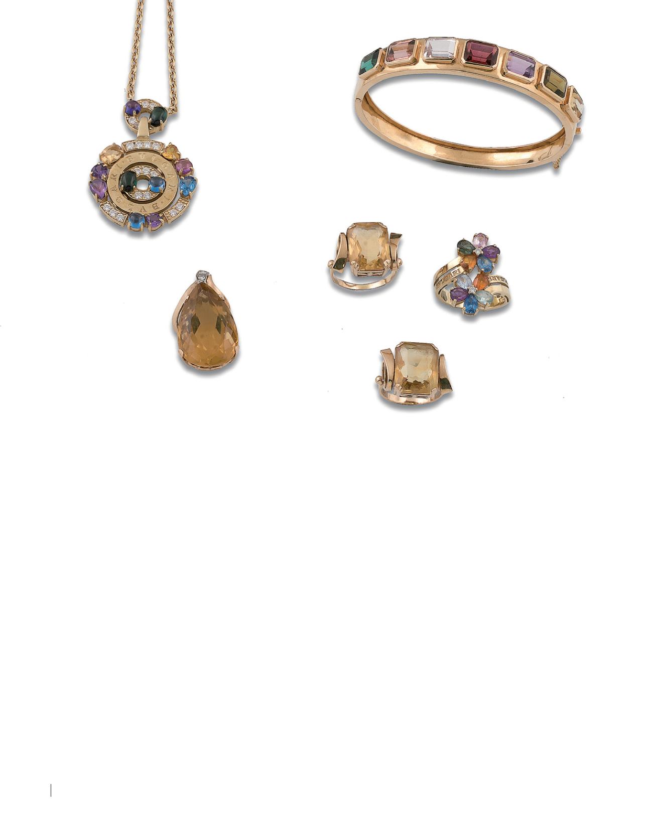 Collar en oro amarillo de 18 kts, centro medallón con amatistas, topacios, cuarzos y turmalina verde, talla oval, brillante y perilla con
