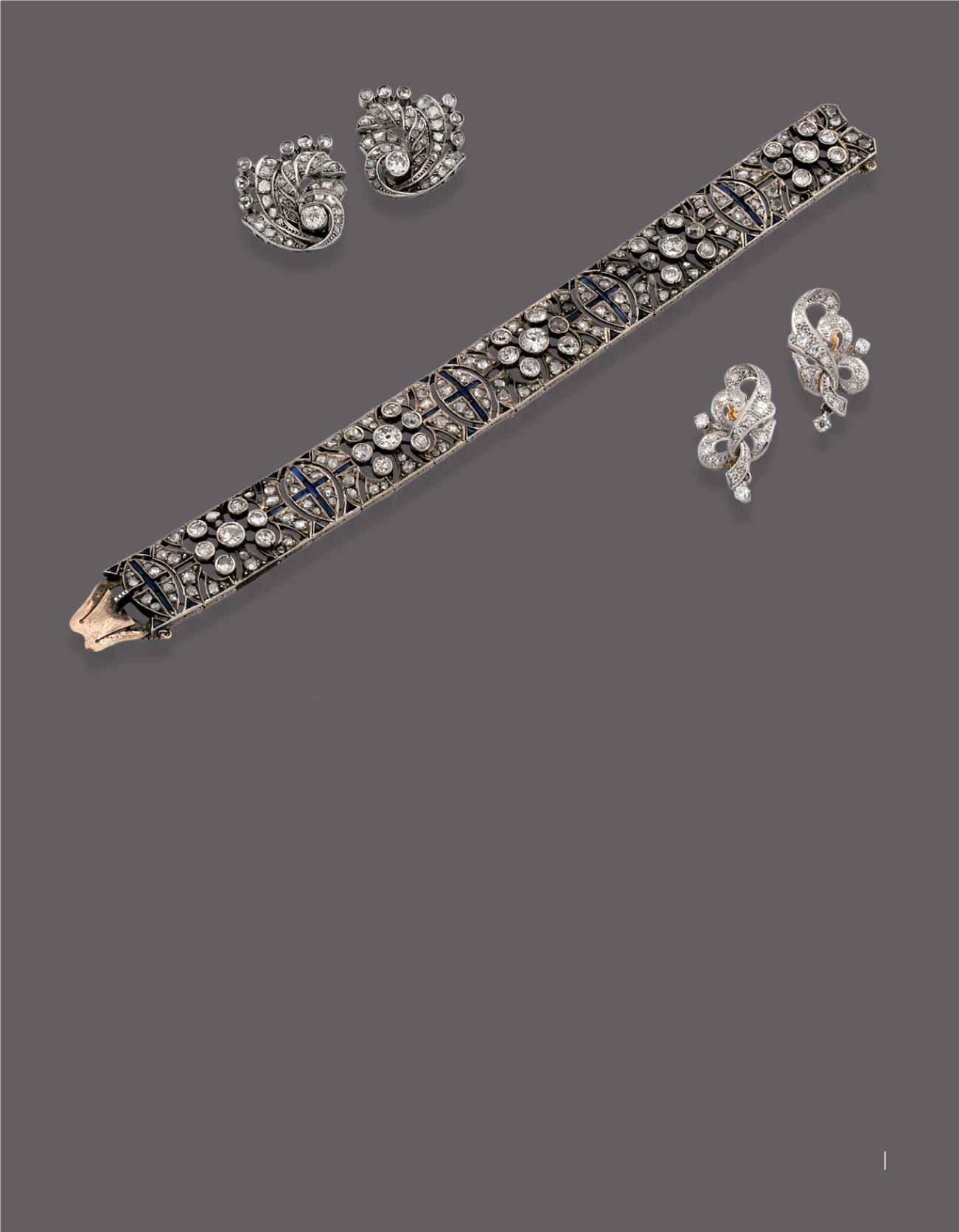 Pulsera circa 1850 en plata 5 centros con diamantes, talla antigua peso estimado de 7 cts, intercalados por diamantes y zafiros sintéticos,