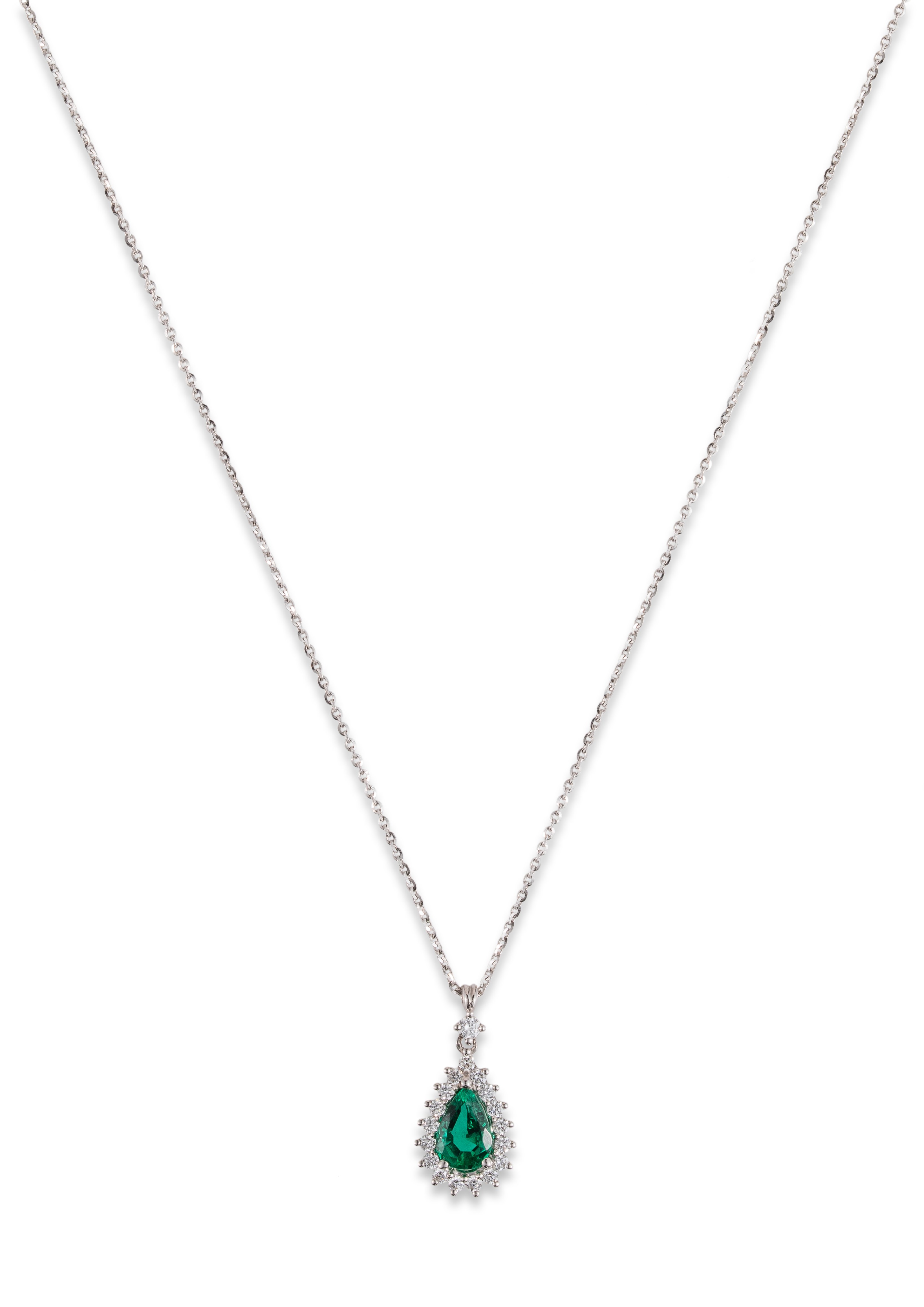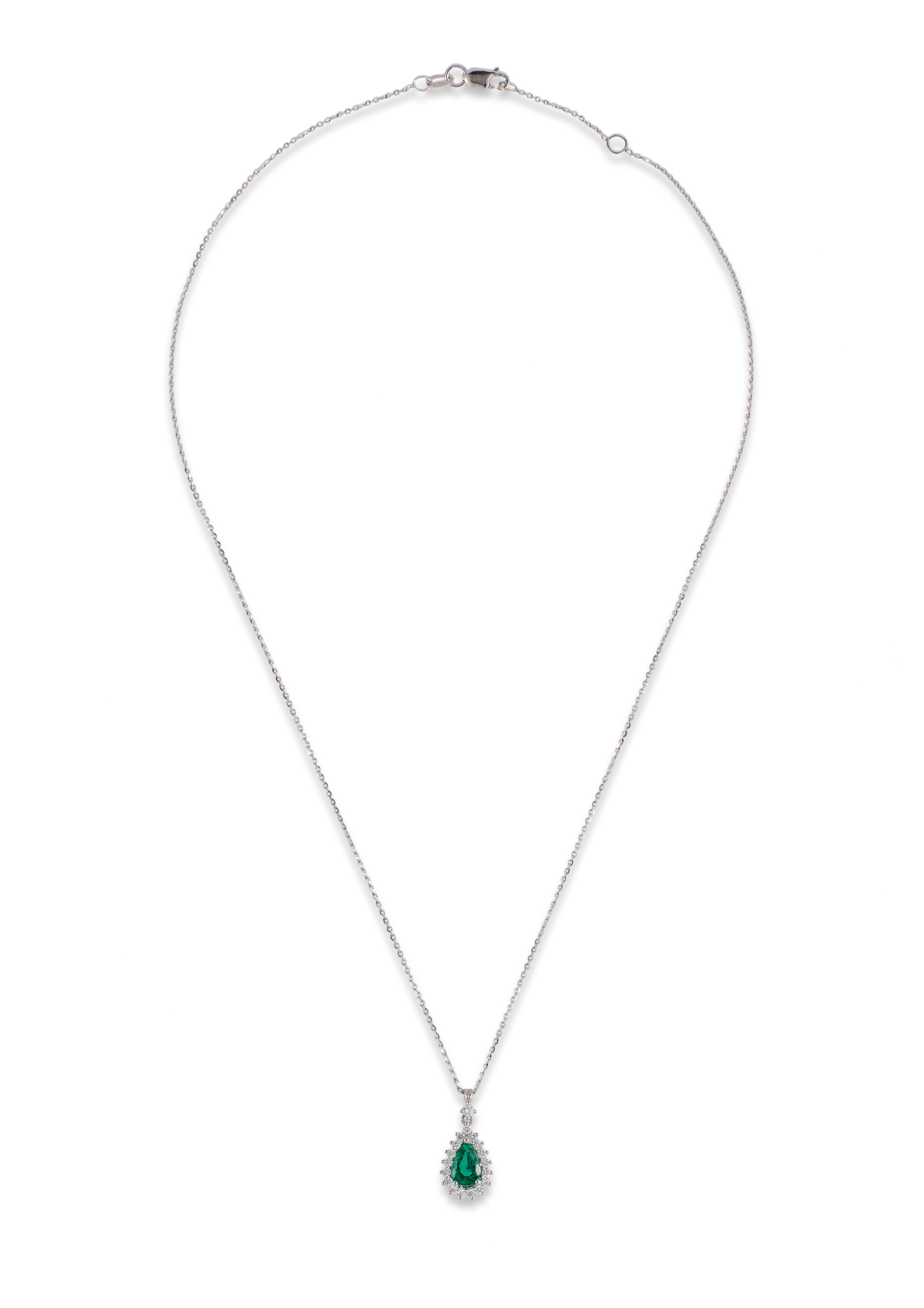 Colgante de oro blanco de 18 kt. con esmeralda talla pera de 0.68 ct. orlado por diamantes talla brillante, peso total 0.27 ct., color F, pureza SI