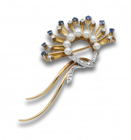 BROCHE AÑOS 60 ORO AMARILLO PERLAS DIAMANTES Y ZAFIROS
