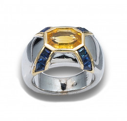 ANCHA SORTIJA DE ZAFIRO AMARILLO Y ZAFIROS, EN ORO BLANCO