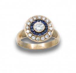 SORTIJA OJO DE PERDIZ DE ORO, DIAMANTES Y ZAFIROS