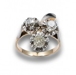 SORTIJA ANTIGUA TRESILLO DE DIAMANTES, EN ORO AMARILLO Y PLATINO