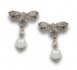 PENDIENTES EN FORMA DE LAZO DE ORO, DIAMANTES Y PERLAS