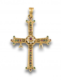 CRUZ DE LA VICTORIA COLGANTE DE ORO AMASRILLO, DIAMANTES, ESMERALDAS, RUBÍES, ZAFIROS Y DIAMANTES