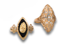 LOTE DE DOS SORTIJAS LANZADERAS ANTIGUAS DE ORO Y ÓNIX