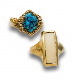 LOTE DE DOS SORTIJAS, AÑOS 70, DE HUESO Y TURQUESA, EN ORO AMARILLO