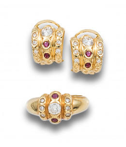 CONJUNTO DE SORTIJAS Y MEDIAS CRIOLLAS EN ORO CON RUBÍES Y DIAMANTES
