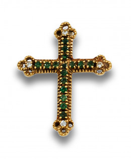 COLGANTE EN FORMA DE CRUZ EN ORO AMARILLO CON ESMERALDAS Y DIAMANTES