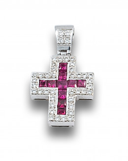 COLGANTE CRUZ DE DIAMANTES Y RUBÍES, EN ORO BLANCO