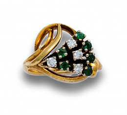 SORTIJA, AÑOS 80, DE DIAMANTES, ESMERALDAS Y ORO AMARILLO