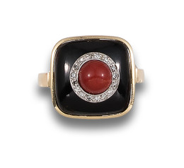 SORTIJA, ESTILO ANTIGUO, DE CORAL, ÓNIX Y DIAMANTES, EN ORO AMARILLO