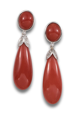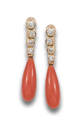 PENDIENTES LARGOS DE CORAL, DIAMANTES Y ORO BLANCO