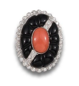 SORTIJA DE DIAMANTES, CORAL Y ÓNIX, EN ORO BLANCO