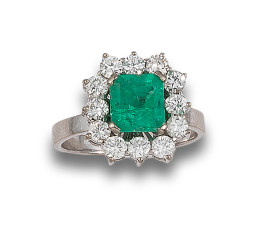 SORTIJA ROSETÓN DE ESMERALDA Y DIAMANTES, EN ORO BLANCO