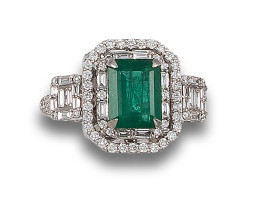 SORTIJA ROSETÓN ESTILO ART DÉCO DE ESMERALDA Y DIAMANTES, EN ORO BLANCO