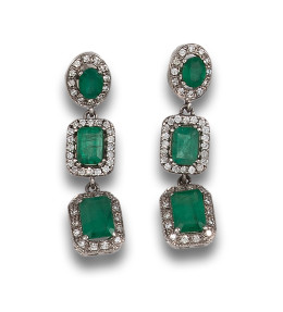 PENDIENTES LARGOS DE ROSETONES DE ESMERALDAS Y DIAMANTES, EN ORO BLANCO