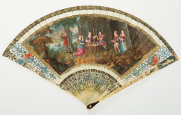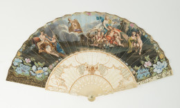 Abanico con varillaje de hueso calado aplicaciones de nácar y de marquetería de paja, país pintyado al gouache con escena mitológica. (Yo creo que es Francia) S.XVIII
