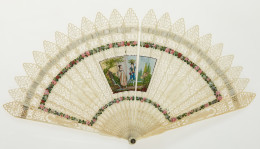 Abanico de baraja hueso calado España, S.XIX. Escena galante en cartela