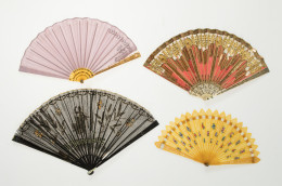 Cuatro abanicos España, S.XIX. Faltas. (uno de baraja de asta, otro varillaje asta y pais pasamaneria, otro varillaje hueso y pais pasamaneria, otro negro)