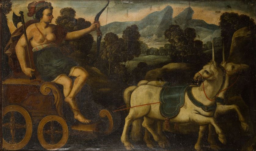 Interesante representación alegórica del continente americano que debió formar parte de una serie formada por cuatro lienzos. Estas representaciones, abundantes en la escuela virreinal, se realizaron con frecuencia en biombos y decoraciones murales y hunden sus raíces iconográficas en series realizadas por Marten de Vos.