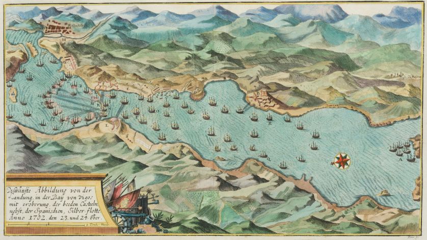 Representación Fidedigna del ataque a la Flota de la Plata. Vista de la Bahía de Vigo con las posiciones y composición de las flotas en la batalla de Rande. Identifica navíos y defensas con letras “A, B…Z” y “aa, bb,..”. Cartela con banderas y cañones para título: “Warhafte Abbildung” y escala. Rosa de ocho vientos con lis al norte. Huella: 20,8 x 37 cm
