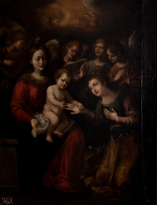 Esta interesante obra, procedente de la importante colección de pintura reunida por José María d'Estoup, nos muestra uno de los episodios más conocidos de la hagiografía de santa Catalina, mártir de Alejandría: el momento de su unión mística con Cristo. Aparece ricamente vestida y con corona, en correspondencia con su linaje, y a sus pies se encuentran sus atributos iconográficos principales: la rueda dentada y la espada, con los que sufrió el martirio, y la palma, por su condición de mártir. El Niño Jesús, en el regazo de la Virgen, se encarga de colocarle el anillo como símbolo de la unión mística entre ambos, mientras el acontecimiento sobrenatural es contemplado por una corte celestial formada por querubines y ángeles mancebos cantores.