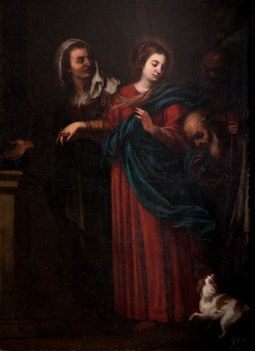 Esta interesante pintura, procedente de la copiosa colección reunida por José María d'Estoup, representa el pasaje evangélico de la Visitación de la Virgen a santa Isabel, en el momento inmediato a su ingreso en la casa de Ain Karem. María recibe las bendiciones de su prima y del esposo de ésta, Zacarías, pues ambos reconocieron en ella la presencia del Verbo encarnado.