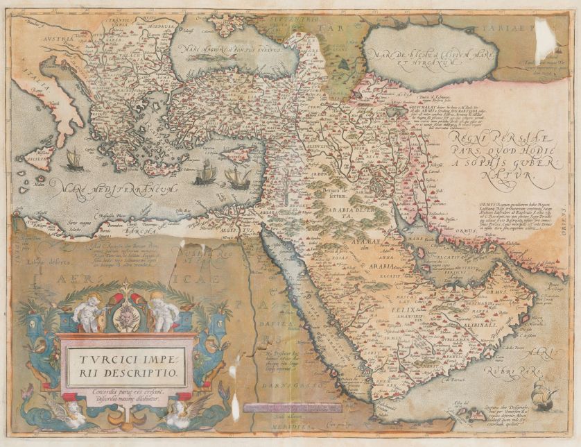 Cartela ornamentada con vegetales y motivos antropomorfos en el ángulo inferior izquierdo con inscripción " Turcici imperii descriptio". En esta vista de mapa se ve Libia, Egipto, Persia y Armenia entre otros. Toponimia en latín. De la obra "Theatrum Orbis Terrarum" de Abraham Ortelius.