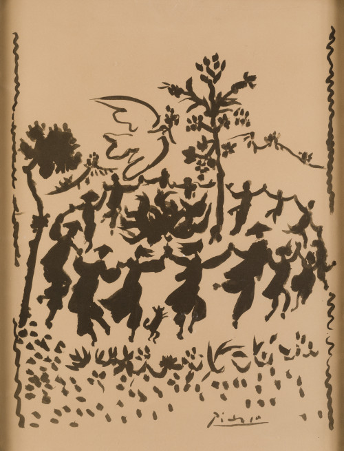 Firmado en plancha. Realizada a partir de la aguada “Vive la paix” que Picasso realizó para la portada del periódico “L’humanité dimanche” del 25 de julio de 1954, con motivo de la firma en Ginebra del tratado del final de la guerra de Indochina. Reproducida en: