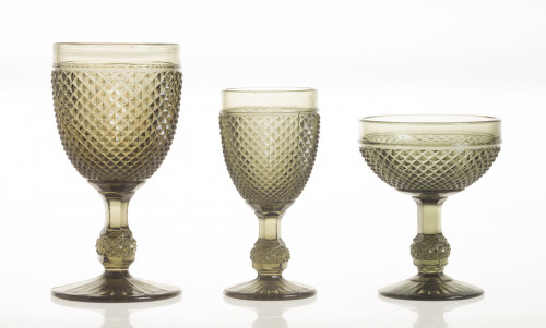 Cristalería posiblemente portuguesa de cristal ahumado, S. XX. Compuesta por 10 copas de agua, 10 de vino y 10 de champagne.