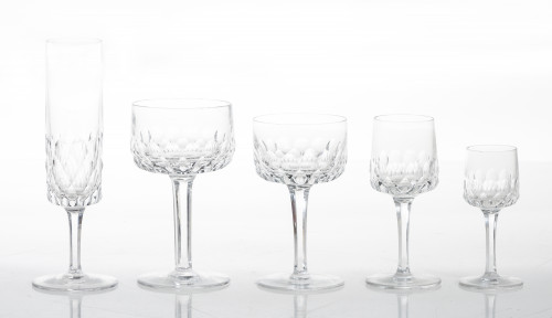 Cristalería transparente de cristal tallado, S. XX. Compuesta por: 9 copas de champagne, 9 de agua, 9 de vino tinto, 9 de vino blanco y 9 de licor. Piquetes.
