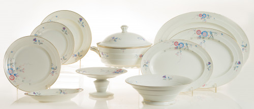 Vajilla de porcelana Rosenthal, España, años 60. Con decoración de flores estampada en tonos azules y coral y filo dorado. Compuesta por: 23 platos llanos, 12 platos hondos, 11 platos de postre, 3 fuentes ovaladas, 1 sopera, 1 ensaladera, 1 entremesera y 1 plato para dulces. Pérdidas en el dorado. Pequeñas faltas.