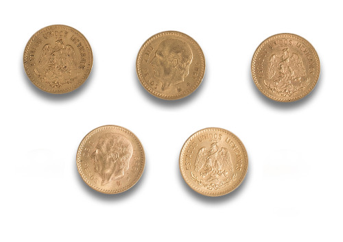 Lote formado por 5 monedas de diez pesos de los Estados Unidos Mexicanos en oro amarillo de 21 kt. Dos de 1906, una de 1908, una de 1920 y una de 1959.