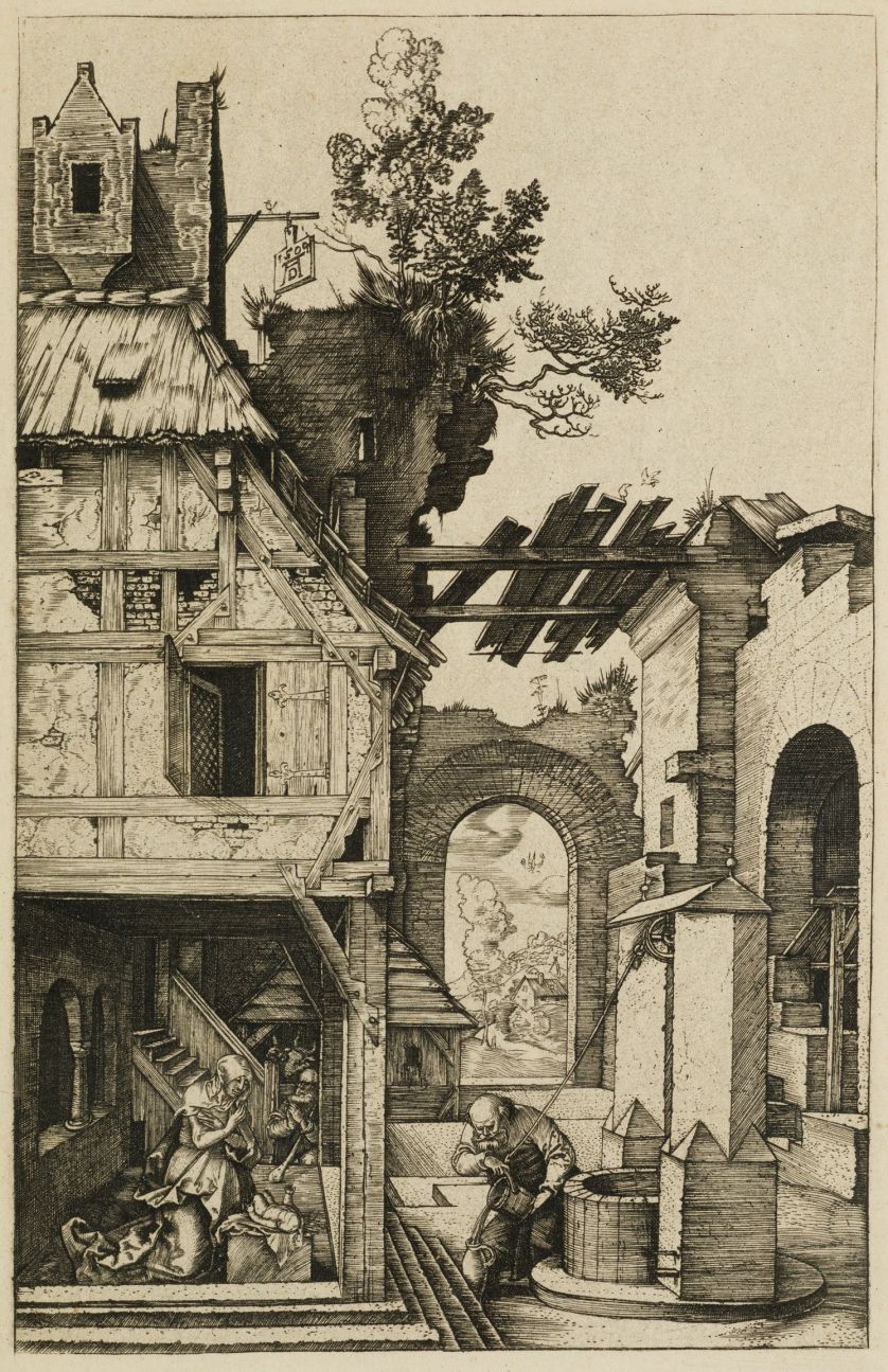 Firmado y fechado con monograma AD y año 1504, en la tablilla que pende del edificio en ruinas que acoge a la Sagrada Familia, (tirada tardía).