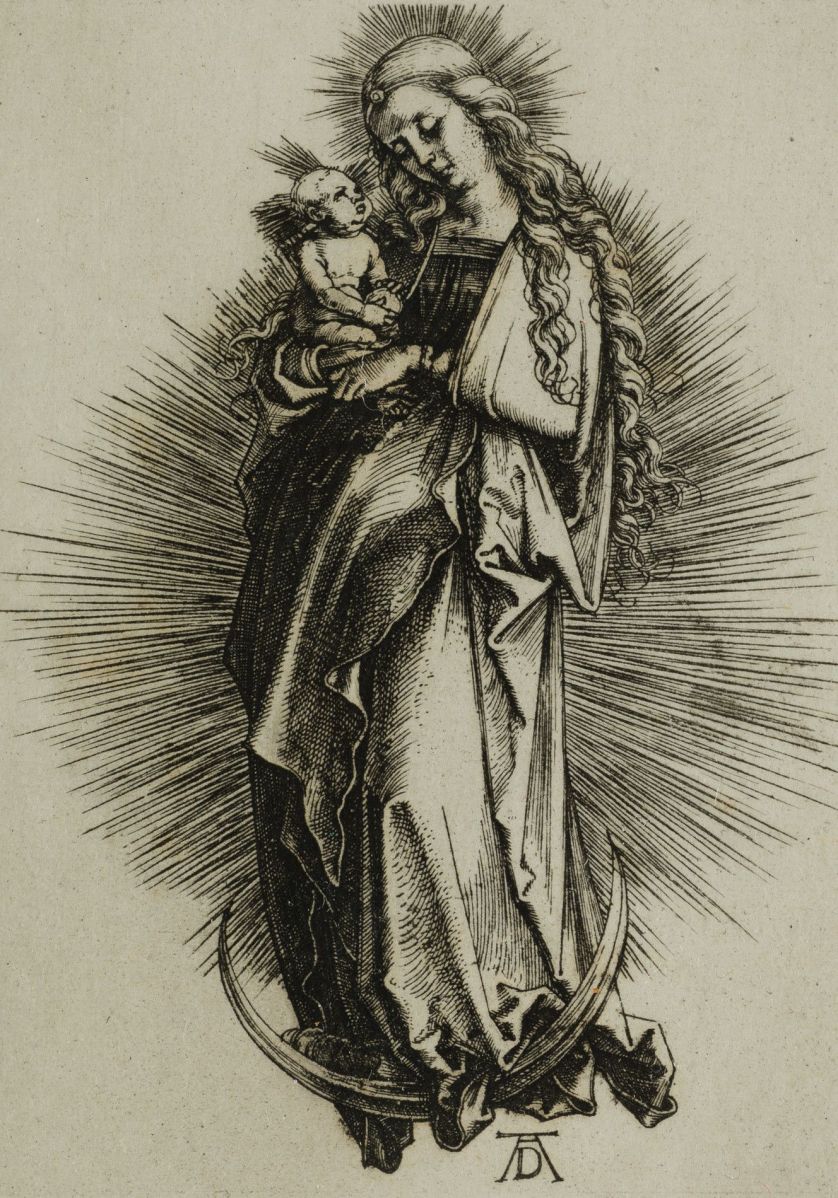 Firmado con monograma AD. Según G. von Wobeser, esta imagen sobre la luna creciente pudo inspirar la de Guadalupe pintada por un indio en 1555.