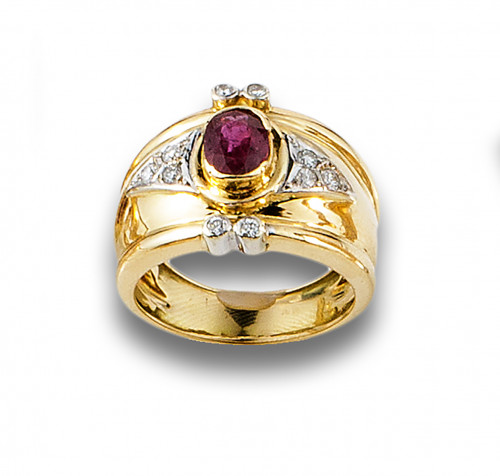 Ancha sortija de oro amatrillo de 18 kt. Formada por un rubí central, talla oval, con detalle de diamantes, talla brillante.