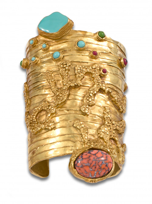YVES SAINT LAURENT de la coleccion Arty en metal dorado texturizado con cabujones de vidrios esmaltados.