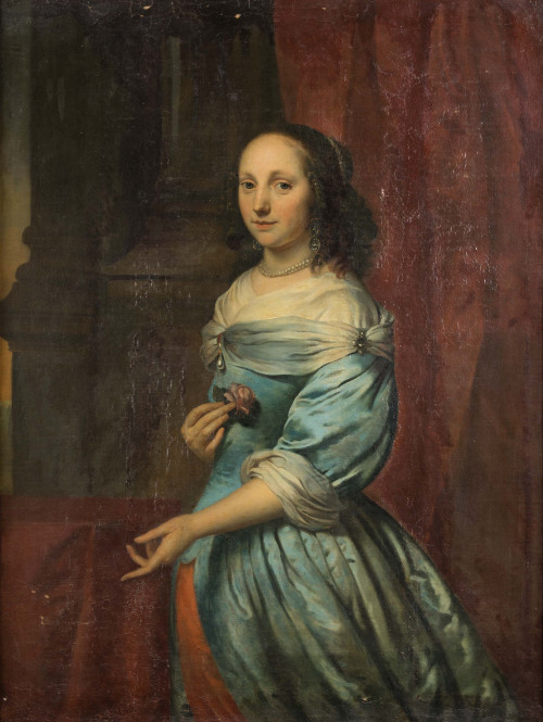 Aunque oriundo de los Países Bajos, Jacob Van Loo fue el iniciador de una importante saga de artistas que desarrollaron su producción en la ciudad de París. Cultivó la pintura de historia, la de género y la mitológica, destacando principalmente como pintor de retratos, tanto colectivos como individuales. Un buen ejemplo de su maestría es este retrato que muestra una dama elegante con un vestido azul que porta una rosa en sus manos. Por sus ragos fisionómicos parece un retrato de Lucretia Boudaen (1616-1663) importante dama que contrajo matrimonio con Jean Ortt y, tras quedar viuda, con Christoffel Van Gangelt. De Jacob Van Loo se conservan otros dos retratos de esta mujer; uno de ellos con una edad más avanzada y otro vistiendo el luto de la viudez. En los tres muestra el mismo tipo de peinado e idénticas joyas.