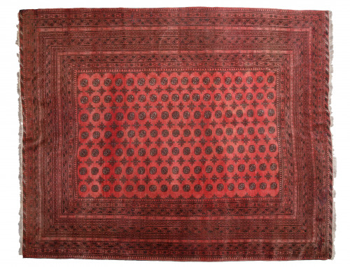 Alfombra Bukhara de lana anudada a mano, S. XX. De campo granate y cenefa con decoración geométrica en tonos oscuros.