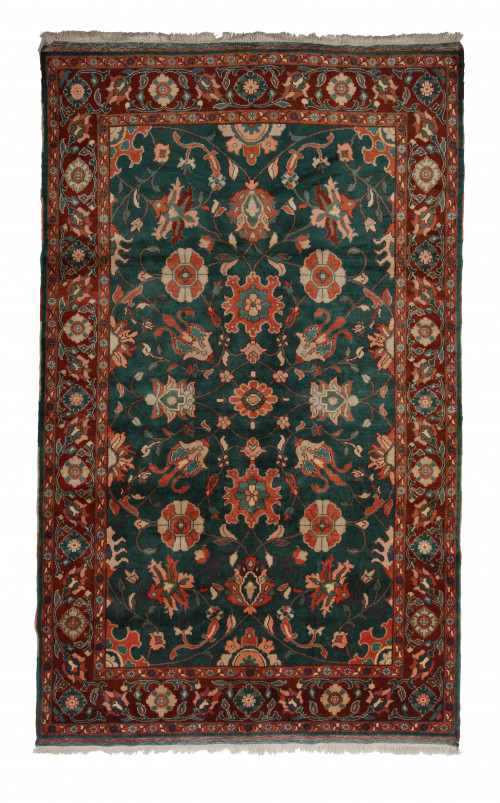 Alfombra de lana, diseño Ziegler, S. XX. De campo verde y cenefa color vino. Con decoración de flores en tonos naranjas y ocres.