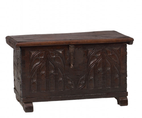 Arca de nogal tallado con decoración de lacerías góticas en el frente, Castilla, S. XIX y anterior. Medidas: 54 x 94 x 47 cm
