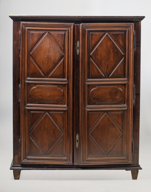 Armario de dos puertas, España, S. XVIII y posterior. Con decoración de cuarterones. Presenta reposiciones, restauraciones y marcas antiguas de xilófagos. Precisa respaso.