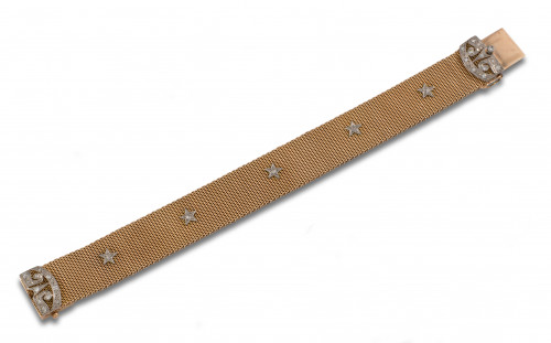 Brazalete malla, años 40, de oro amarillo de 18 kt. con vistas en platino. Cierre hebilla de diamantes, talla simple. Sistema de cierre de presión con doble ocho de seguridad. Peso: 45 Gr..
