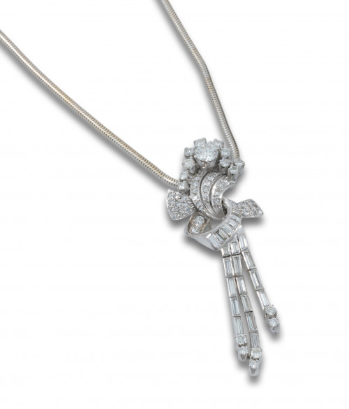BROCHE CLIP Y CADENA ORO DIAMANTES Broche-clip años 50 oro blanco de 18kts, diseño de lazo con centro diamante, talla brillante peso estimado de 0.90cts, Broche-clip años 50 oro blanco de 18kts, diseño de lazo con centro diamante, talla brillante peso estimado de 0.90cts,