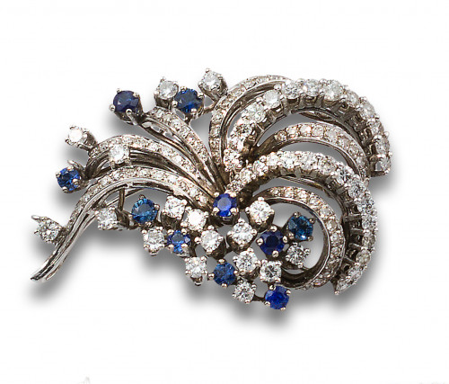 Broche flor de oro blanco de 18 kt. formado por diseño de diamantes, talla brillante y zafiros, talla redonda. Engaste en grano y en garras.