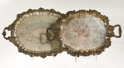 Bandeja de plata con asas, España, med. S.XX. Con decoración de hojas y rocalla en el alero y en el asiento.