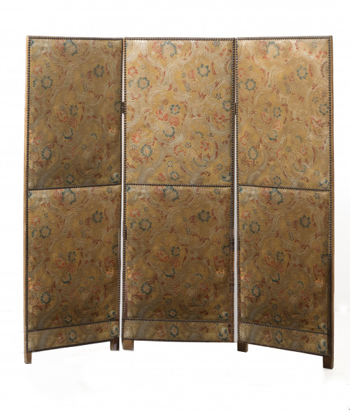 Biombo de tres hojas atribuido a José Lapayese (1899-1982) realizado con la técnica de cordobán. Motivos florales y vegetales en reservas de acanto. Mínimos desperfectos.