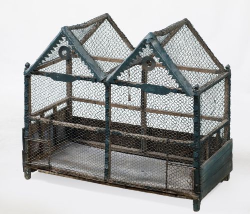 Wooden frame and green polychrome metal grating. It has flaws and rust marks. Dimensions: 73 x 90 x 43 cm