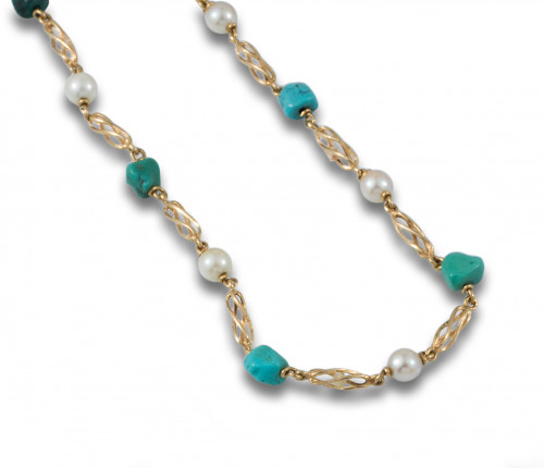 Cadena de oro amarillo de 18 kt., de eslabones intercalados por perlas cultivadas y turquesas.